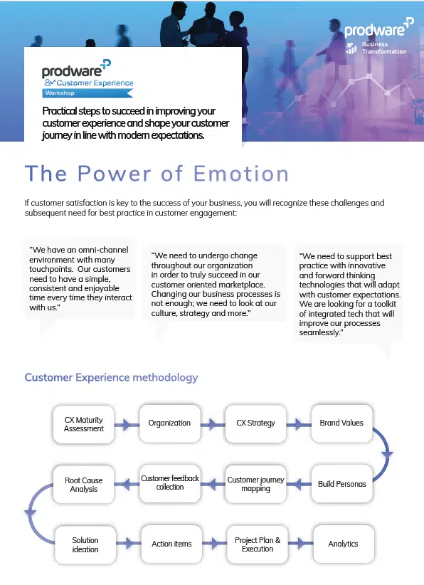 Prodware’s Customer Experience consulting approach includes elements such as Customer Journey Mapping, Customer Persona Profiling, and Customer Feedback; in order to achieve understanding, define working practices and allow our clients to engage with their customers in a more successful way.