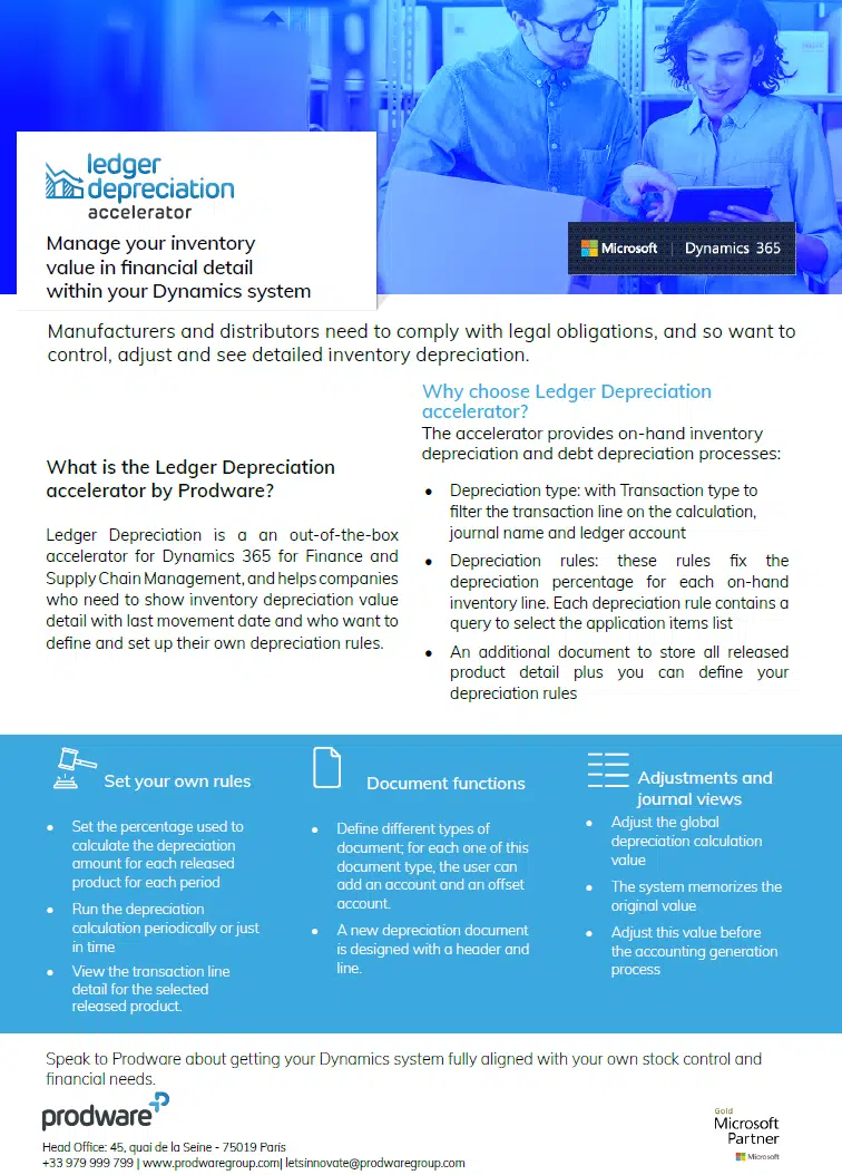To help, this Ledger Depreciation accelerator for Microsoft Dynamics 365 Finance and Supply Chain Management has two additional parameters – Depreciation Type and Depreciation Rules. Plus, an additional document to store all released product detail plus users can define their depreciation rules.