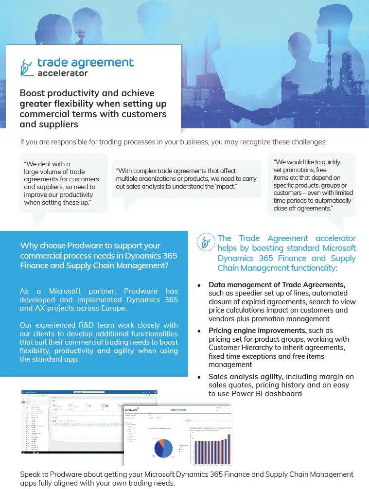 The Trade Agreement accelerator for Microsoft Dynamics 365 Finance and Operations provides additional flexibility in three key areas, boosting agility and productivity: Data management, Pricing engine and Sales analysis.