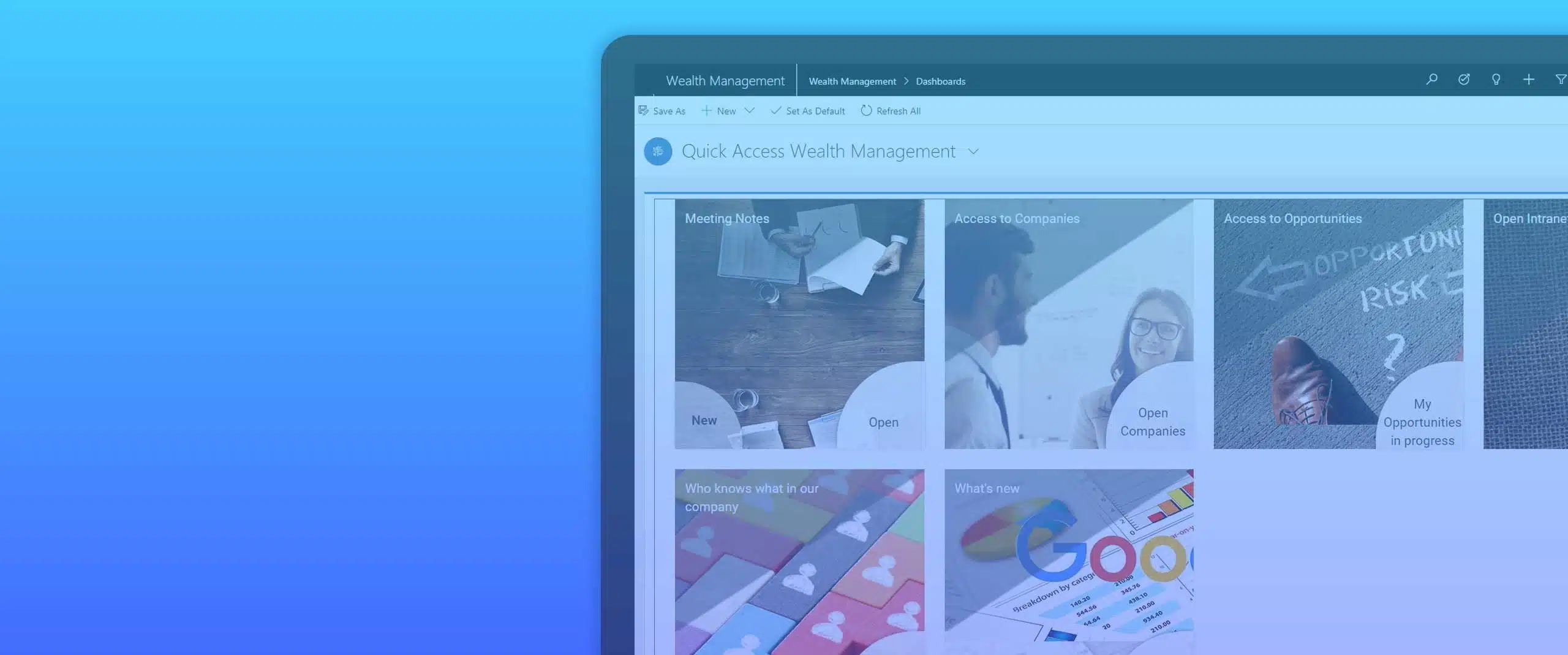 Los gestores de patrimonio, los expertos en seguros y los banqueros disfrutarán de las características específicas de su sector. La solución de gestión del patrimonio, totalmente integrada en Microsoft Dynamics 365 for Sales, está estructurada en torno al CRM más potente del mercado con funcionalidades adaptadas a este sector tan competitivo. Esta solución cumple con los requisitos de productividad de los gestores de patrimonio, con la necesidad de integrar datos externos, con la conectividad del middle y back office y de los procesos KYC (know your customer).