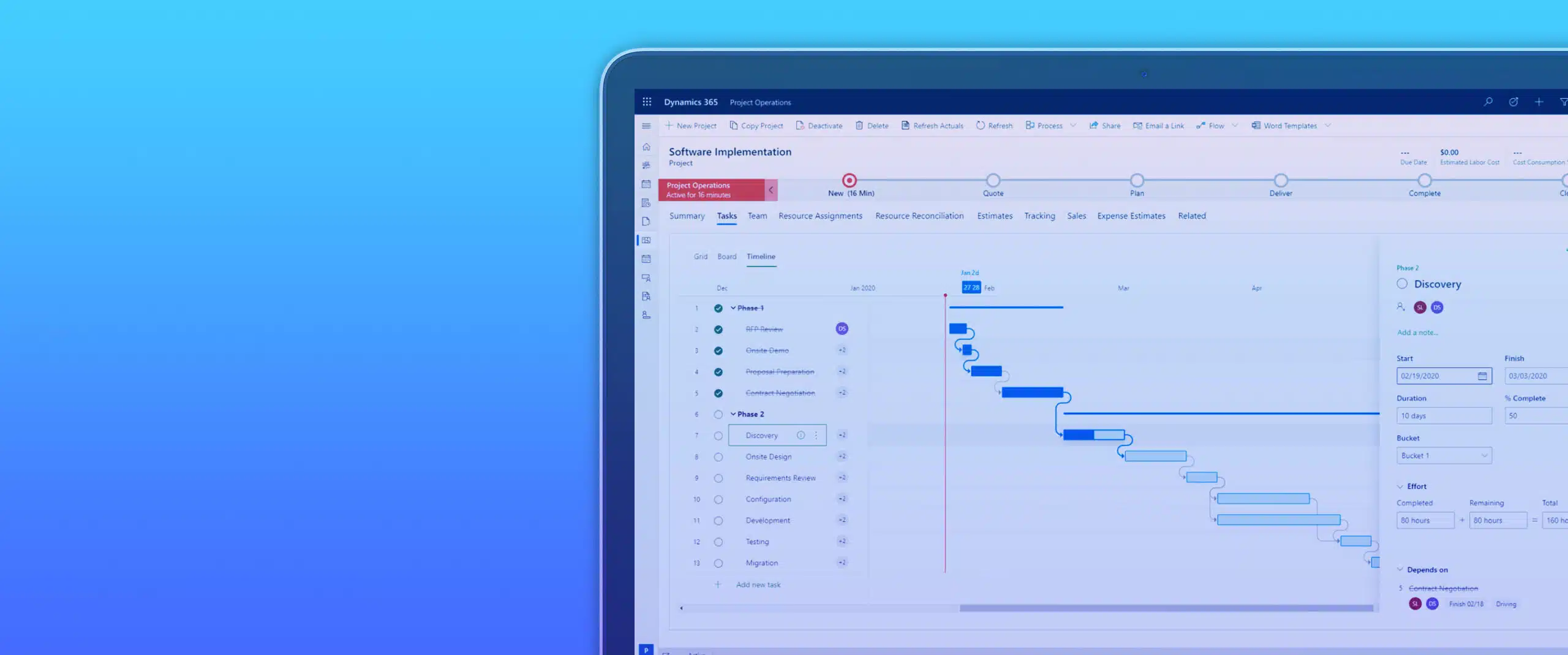 Y es que ahora más que nunca, construir relaciones con nuestros clientes y mantener una reputación sólida en el mercado depende de la capacidad para ofrecer experiencias únicas, conectadas y de calidad desde la venta hasta la entrega de un proyecto. Project Operations te ayudará a conseguir estos objetivos reduciendo el ciclo de negociación y permitiéndote pasar sin problemas de la fase de estimación a la de ejecución. También te permitirá ofrecer experiencias excepcionales en la gestión de operaciones con precios flexibles, ofertas más precisas, previsiones, estimaciones y recursos para la gestión de contratos.