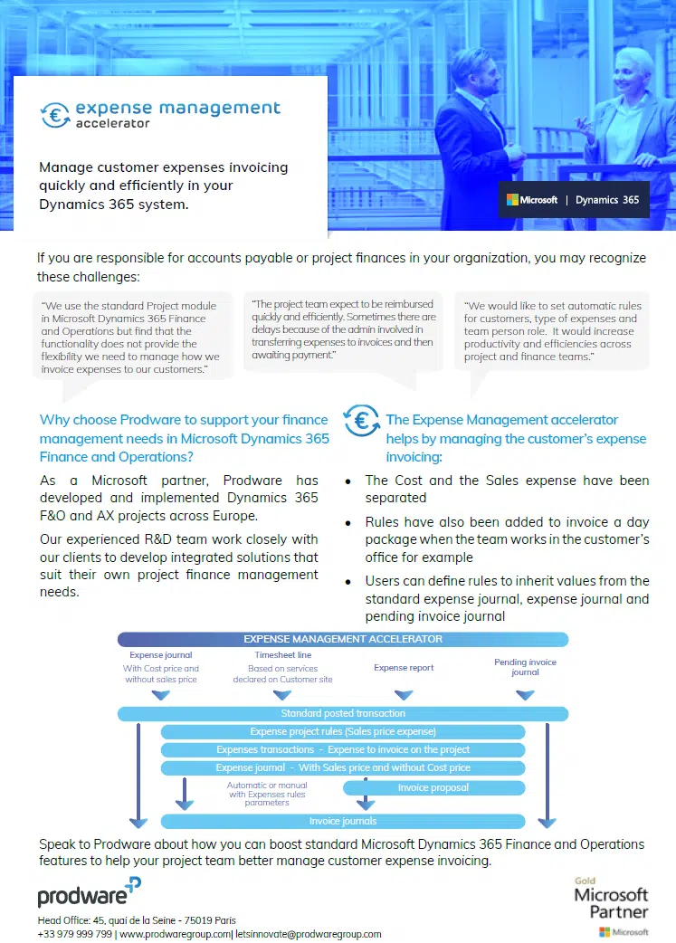 Le module Projet de la version standard de Microsoft Dynamics 365 Finance ne vous offre peut-être pas suffisamment de souplesse pour la facturation des dépenses aux clients.