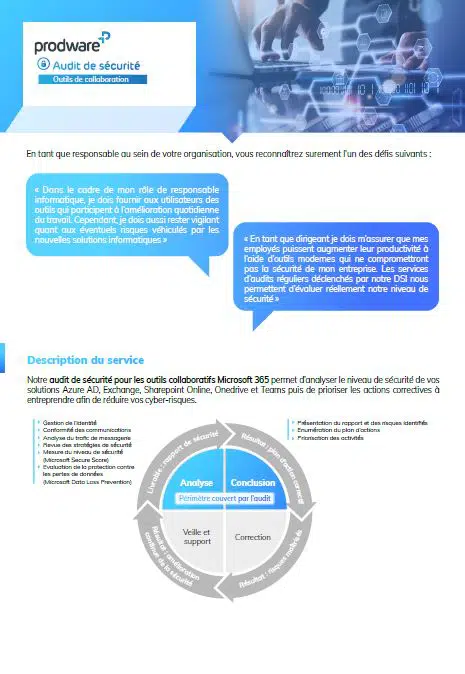 Les entreprises ont besoin de s’assurer que leurs équipes bénéficient d’outils collaboratifs fiables qui ne compromettent pas les données et la sécurité de l’entreprise. Afin de s’assurer de la sécurité et de la fiabilité de vos outils collaboratifs Microsoft 365, nous vous proposons donc de réaliser un audit permettant d’évaluer le niveau de sécurité de vos solutions.
