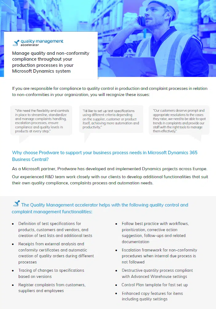 L’accélérateur de contrôle de la qualité pour Microsoft Dynamics 365 Business Central permet de gérer la qualité et la conformité tout au long des processus de production, d’inventaire, d’approvisionnement et de vente.