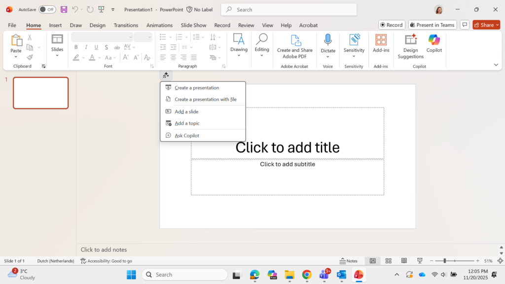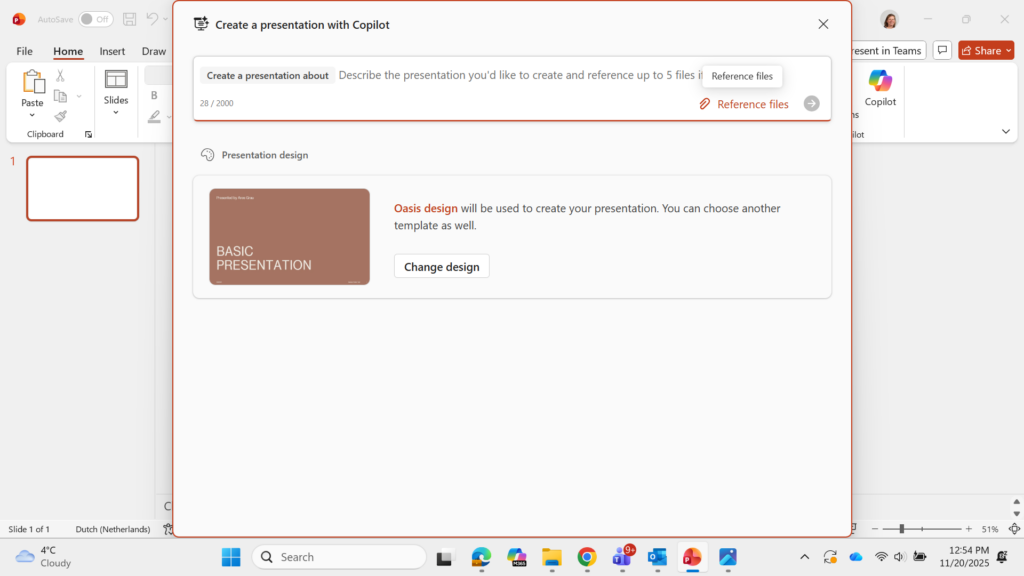 - Professionele Vormgeving: Copilot past automatisch de huisstijl of een geschikt thema toe, zodat de slides er direct verzorgd uitzien.