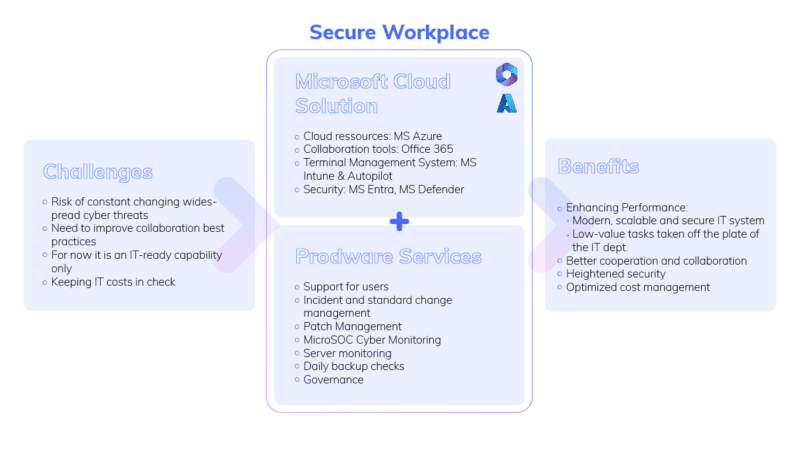 Secure Workplace is a comprebensive managed service offering that covers users, their terminals and the company’s servers. This package provides the best Microsoft tools for collaboration, asset management while reinforcing cybersecurity.